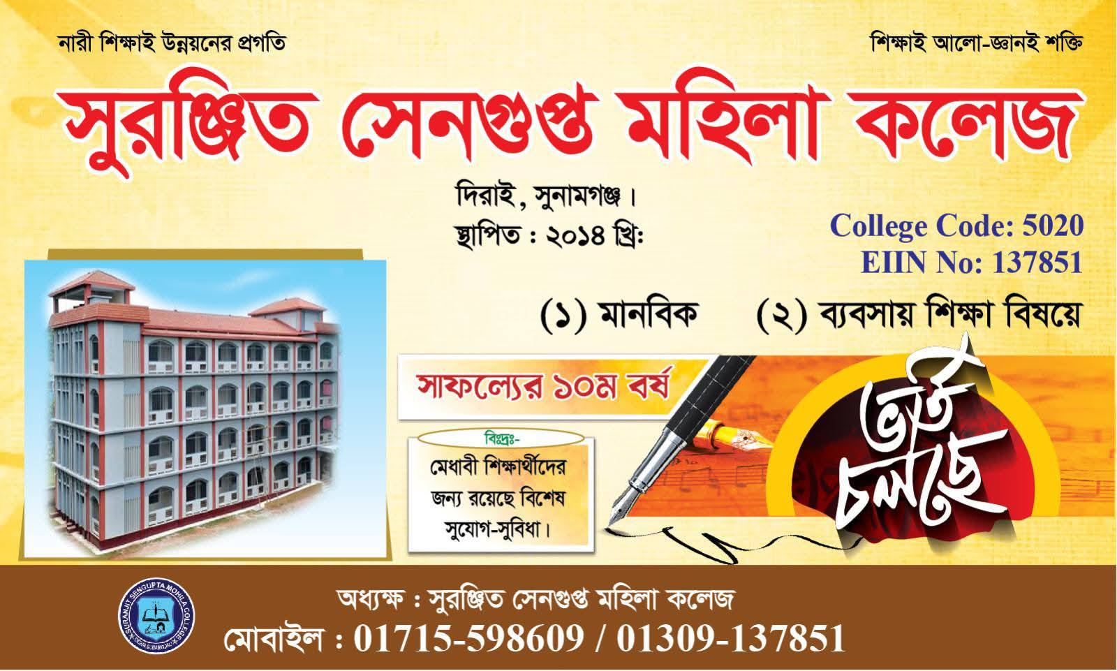 সুরঞ্জিত সেনগুপ্ত মহিলা কলেজের প্রতিষ্ঠাতার বাণী: “শিক্ষাই জাতির মেরুদণ্ড, এবং নারী শিক্ষা উন্নয়নের মূল শক্তি। আমি বিশ্বাস করি, এই কলেজ প্রতিষ্ঠার মাধ্যমে আমাদের দেশের নারী শিক্ষার প্রসার ঘটবে, যাতে তারা সমাজে আত্মনির্ভরশীল ও কর্তৃত্বশীল ভূমিকা পালন করতে পারে। আমি আশা