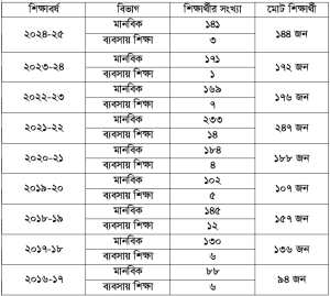 কলেজে বিভিন্ন বছরে শিক্ষার্থীদের সংখ্যা fluctuation লক্ষ্য করা যায়। নীচে কিছু পরিসংখ্যান তুলে ধরা হলো: