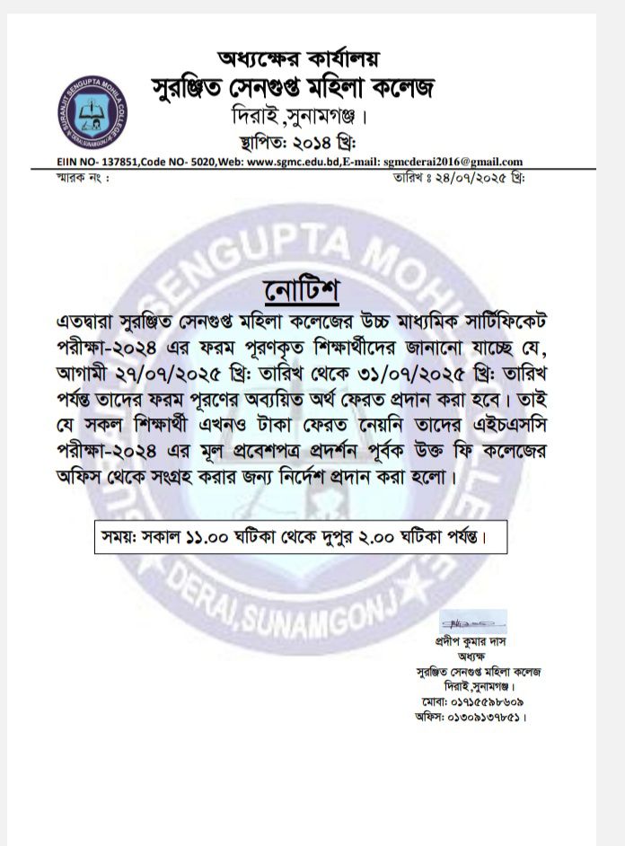 ফরম পূরনকৃত শিক্ষার্থীদের অব্যয়িত অর্থ ফেরত প্রদান